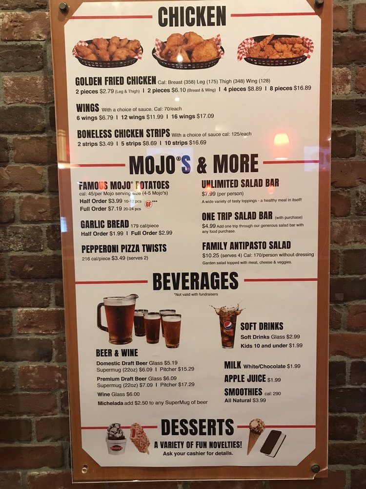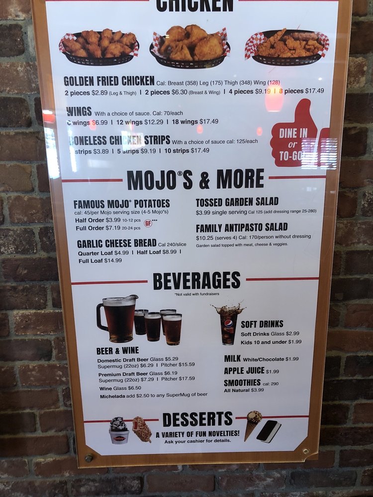 Includes pc chicken, leg & thigh, Mojo potatoes and a bottle of soda ( oz) available AM-PM daily.